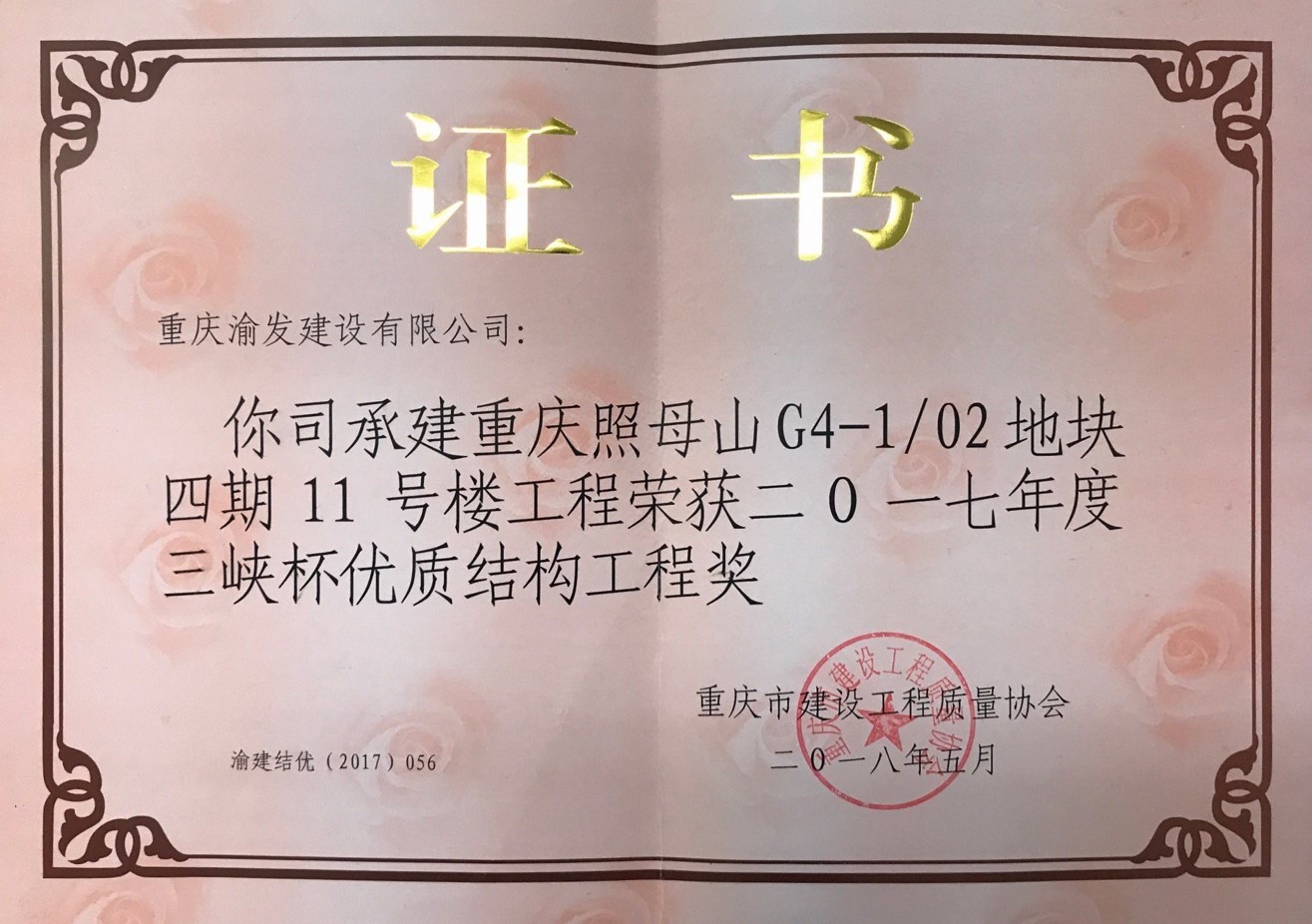 我司承建的重慶照母山G4-1/02地塊四期11號(hào)樓工程榮獲2017年度"三峽杯"優(yōu)質(zhì)結(jié)構(gòu)工程獎(jiǎng)。"三峽杯"優(yōu)質(zhì)結(jié)構(gòu)工程獎(jiǎng)是重慶市市級(jí)建設(shè)工程質(zhì)量獎(jiǎng),每年評(píng)選一次...